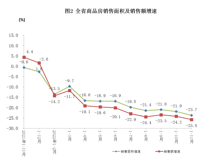 1—11月,湖南房地开发投资、商品房销售面积持续负增长。