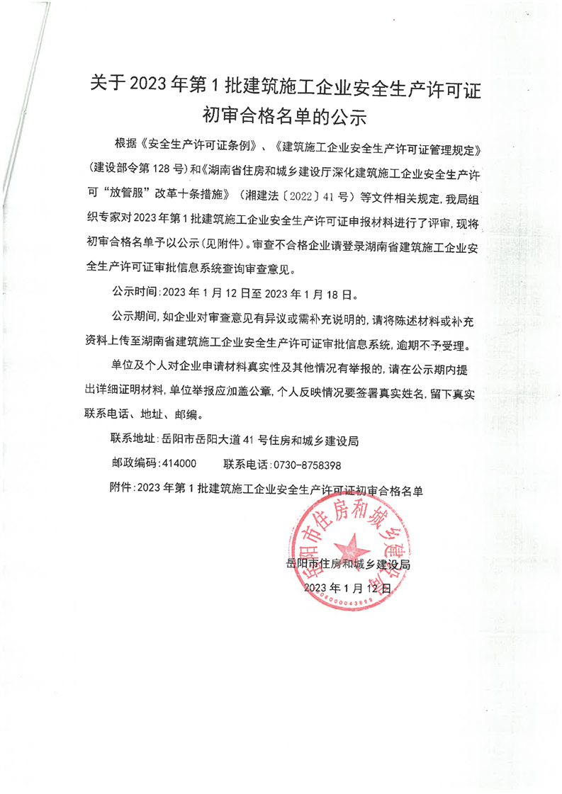 关于2023年第1批建筑施工企业安全生产许可证初审合格名单的公示