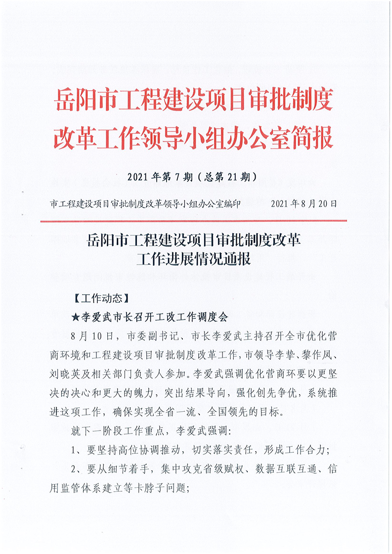 市工程建设项目审批制度改革工作领导小组办公室第21期简报