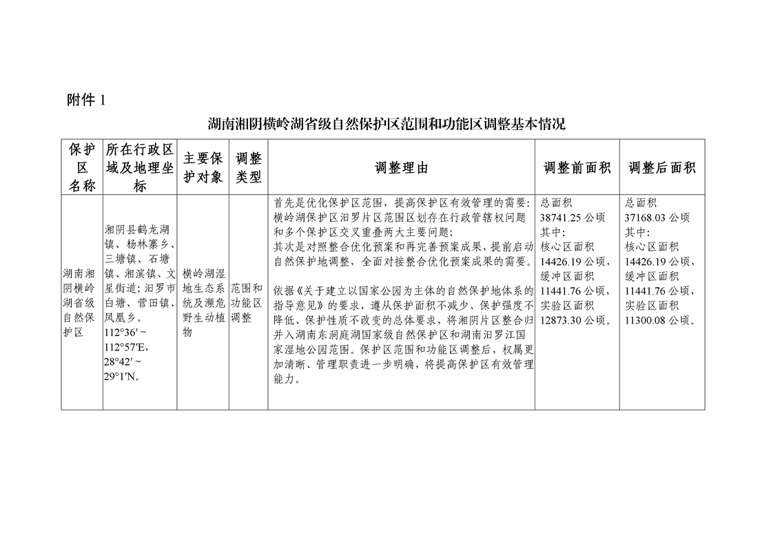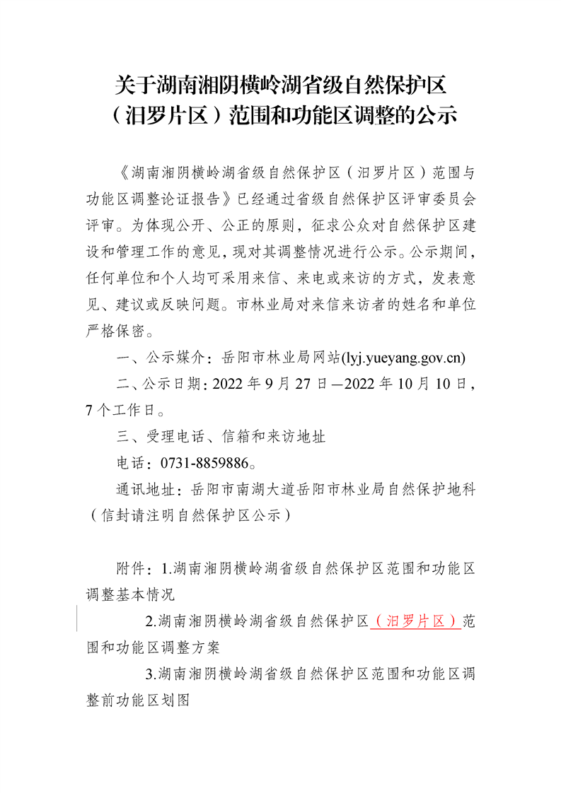关于湖南湘阴横岭湖省级自然保护区 (汨罗片区)范围和功能区调整的公示