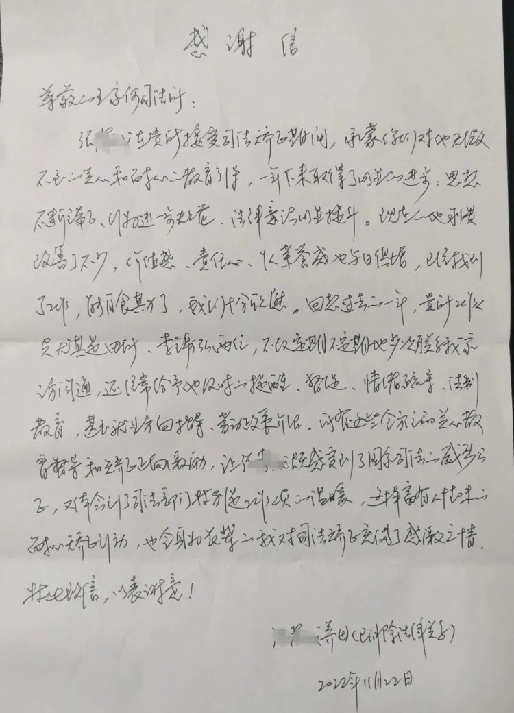 “你们多次给予他情绪疏导、法治教育,还有就业方向指导、劳动政策介绍,让我们感受到国家司法的威严公正,又体会到了司法行政部门的温暖……”,11月22日,岳阳楼区司法局王家河司法所收到一封来自社区矫正对象张某母亲的感谢信,内容简短却充满真情,语言朴实却不乏感动,字里行间都透露着对司法所工作人员的深深的肯定和感激。