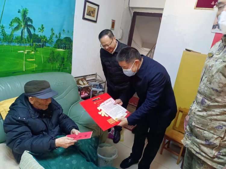 1月18日下午,在2023年新春来临之际,君山区人武部政委吕金阶、区人民政府副区长虢汉平、区退役军人事务局局长王威一行,上门到君山区“百岁老兵”余一家中开展走访慰问活动,传递党和政府的关怀与温暖,并向他致以崇高的敬意和诚挚的问候。