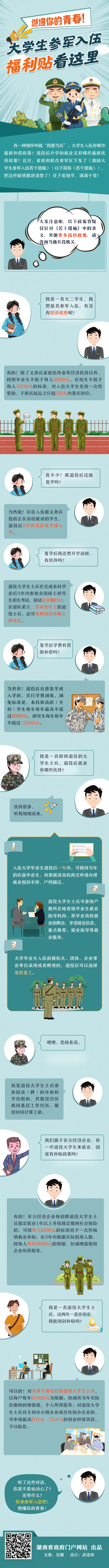 有一种情怀叫做“我要当兵”。大学生入伍有哪些最新补偿政策?退役后升学和就业又有哪些最新优待政策?近日,省政府联合省军区下发了《激励大学生参军入伍若干措施》(以下简称《若干措施》),把这些疑惑都讲清楚了!往下看细节,满满干货!