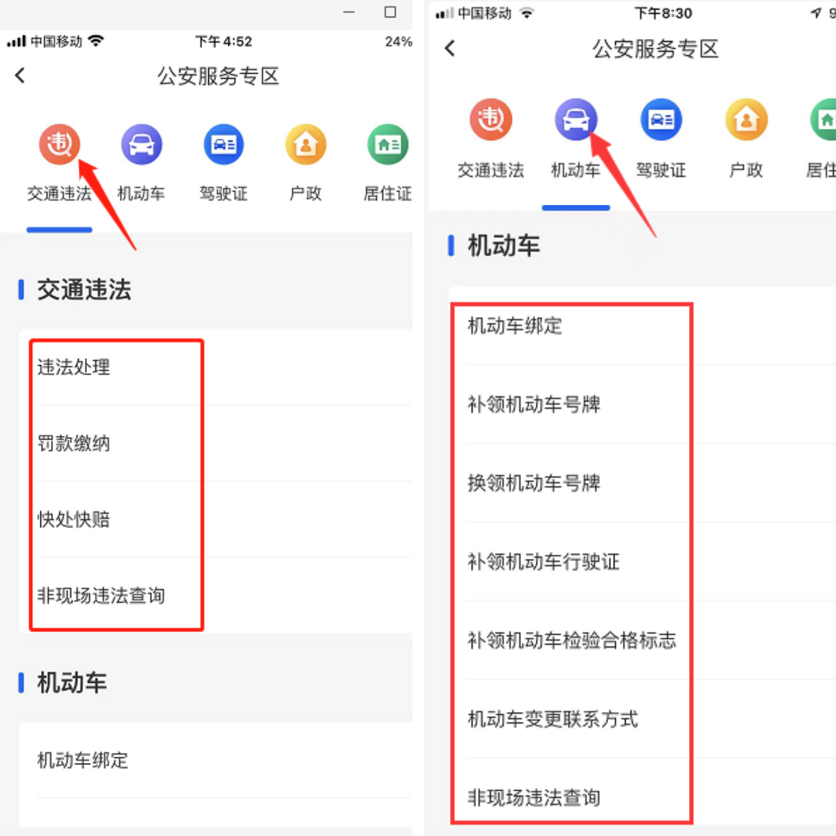 同样,打开“岳办岳好”APP,在首页“特色专区”,点击“公安服务专区”,选择“交通违法”,可办理违法处理、罚款缴纳、快处快赔 、非现场违法查询 4个事项;选择“机动车”,可处理机动车绑定、补领机动车号牌、换领机动车号牌、补领机动车行驶证、补领机动车检验合格标志、机动车变更联系方式、非现场违法查询6个事项。