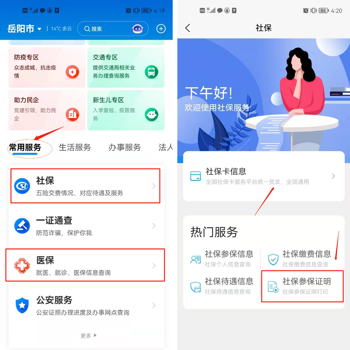 申请人可在手机应用市场下载“岳办岳好”APP,在首页“常用服务”栏,点击“社保”,可以领取电子社保卡、详细查看五险交费情况、对应待遇及服务,此外还可以预览“社会参保证明”。同样,在首页“常用服务”栏点击“医保”也可进行就医、就诊、医保信息查询。