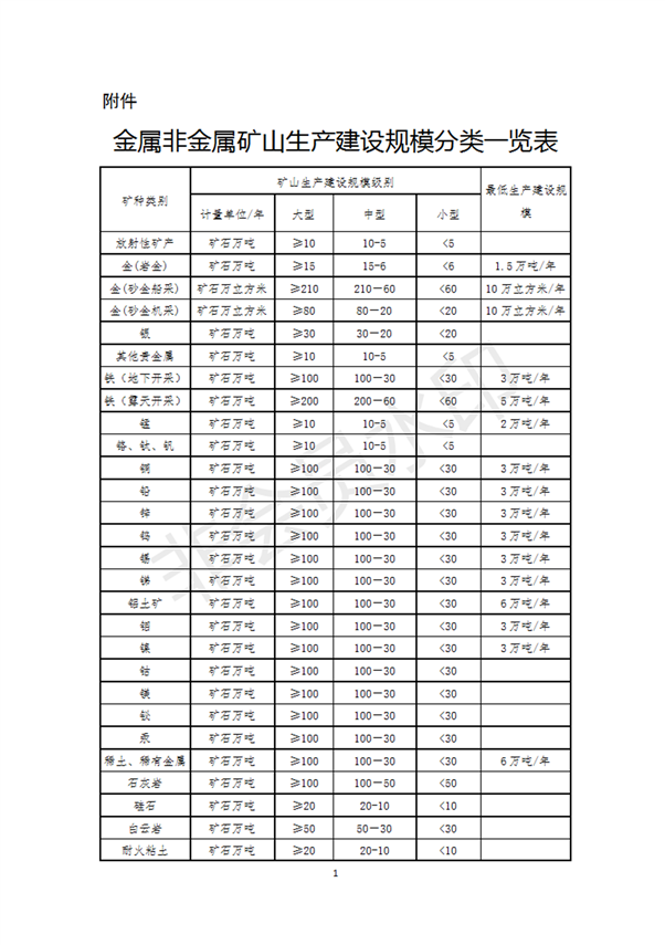 附件:金属非金属矿山生产建设规模分类一览表