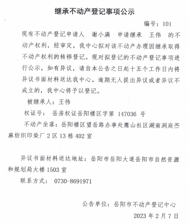 继承不动产登记公示 编号:谢小满(101)